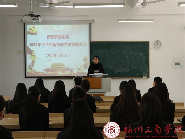 为进一步教育引导新发展党员铭记入党初心、强化党员意识、坚定理想信念,做好党性教育,增强党组织的凝聚力和战斗力。1月5日,在线买世界杯平台党委在教学楼B203组织召开2023年下半年新发展党员宣誓大会,此次会议由党委书记郑杰主持,全体新发展党员参会。