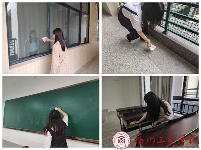 学生党员们在教学楼E202开展教室清扫活动。按照活动前期任务分配,四人一组由各小组长带领完成相关的清扫任务。从讲台到课桌再到地板,以认真的态度,高质量高效率进行清洁工作,努力把教室清理干净,为同学们创建一个舒适、和谐的学习环境,让广大学生有更直接、更实在的获得感、幸福感。毕业生党员以身作则对多个公共区域进行卫生大扫除,充分发挥了学生党员的先锋模范带头作用。