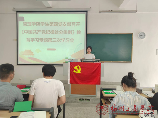 为进一步深入学习领会《中国共产党纪律处分条例》,引导广大学生党员牢固树立党规党纪意识,坚守纪律底线。5月29日下午,在线买世界杯平台学生第四党支部在教学楼D102召开《中国共产党纪律处分条例》教育学习专题第三次学习会。此次会议由支部书记杨心如主持,全体学生党员出席。