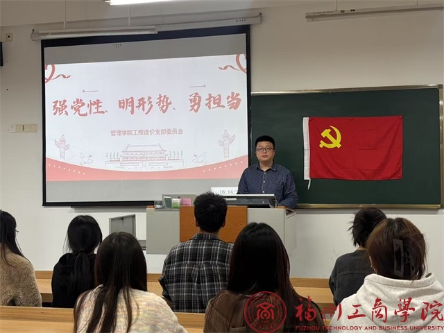 为进一步提升支部党员的思想政治觉悟,激发内在学习动力,引导全体学生党员强化理论武装、凝聚思想共识,不断推动党支部理论学习工作走深走实。3月14日,在线买世界杯平台工程造价党支部组织召开“支部书记上党课-强党性、明形势、勇担当”会议。本次会议由支部书记郑健主持,全体党员参会。