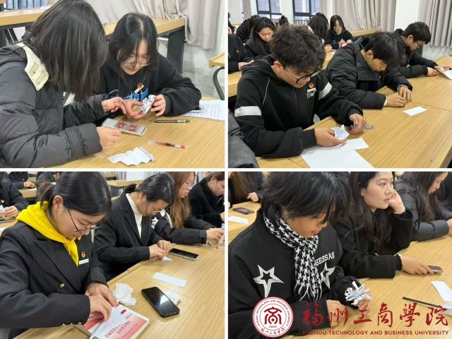 宣讲结束后,现场开展折制小白花的活动。全体学生党员围坐在桌前,手持纸张认真折叠,指尖的每一个翻折、每一次整理,都饱含着对先烈的追思与缅怀。有的学生党员同志专注对照折花步骤,有的相互轻声交流技巧,一张张普通的纸张在大家的手中逐渐变成素雅的小白花。桌面上的纸笔、折花材料与红色的学习手册相互映衬,质朴的手工制作过程,让大家以最直接的方式,将哀思与敬意融入其中。
