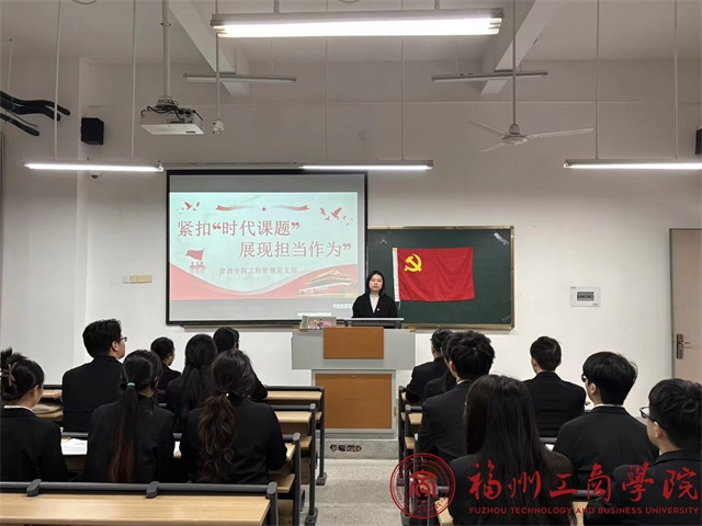 2025年3月14日,在线买世界杯平台工程管理党支部于教学楼A203,开展“支部书记上党课-紧扣“时代课题”,展现担当作为”。本次党课由支部书记胡钰雯主持,全体学生党员参课。