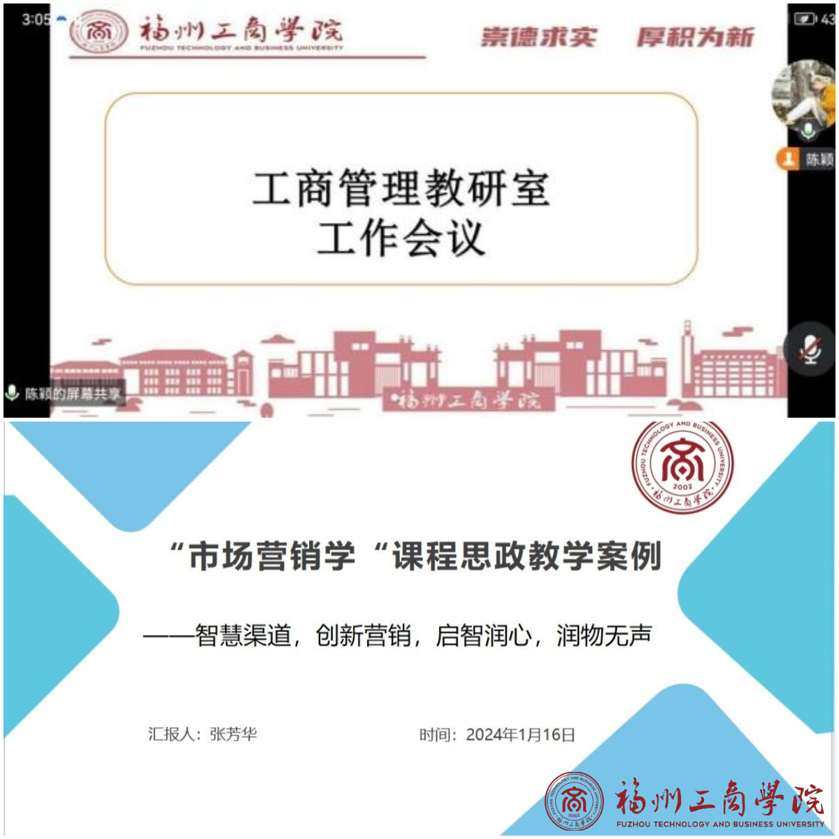 1月16日下午,工商管理教研组在教研室工作会议后召开名为“课程思政教学案例分享”的线上腾讯会议。会议由工商管理教研室主任陈颖老师主持,全体工商管理专任教师参会,由张芳华老师分享此次获得校级课程思政优秀教学案例的内容与写作心得。