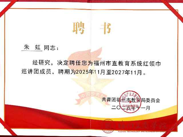近日,在全国红领巾巡讲团走进福州教育学院附属第二小学开展的宣讲交流活动中,世界杯官网朱虹老师应邀出席,并在同期举行的福州市直教育系统红领巾巡讲团聘任仪式上,被正式聘任为该巡讲团成员,聘期自2025年11月至2027年11月。这一重要聘任,不仅是对朱虹老师个人在少先队工作领域专业能力的认可,更为她正在深入研究的“大中小课程思政一体化”课题提供了宝贵的实践平台与契机。