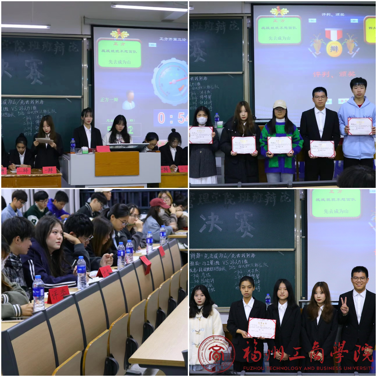 本次辩论赛的正方是来自2023级工商管理1班的四位辩手,他们的论点是“先去成为山”。反方是来自2023级人力资源管理1班的四位辩手,他们的论点是“先去找到海”。首先,场上的辩手就自己的观点进行立论陈词,思维清晰、逻辑严谨。紧接着在攻辩环节中,正方辩手逻辑清晰,连连发问,反方辩手也毫不示弱,有力还击,双方辩手宛如流水一般滔滔不绝,精彩的陈述博得全场喝彩,现场气氛十分活跃。最后,经过激烈的辩论,2023级工商管理1班获得冠军,2023级人力资源管理1班获得亚军。