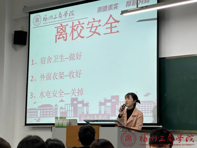 本次班会围绕学生离校安全为主要内容。首先宿舍卫生问题,提醒同学在放假前把宿舍内务卫生收拾好,留下整齐干净整洁的宿舍环境再离校。张春梅老师通过列举学院里面真实发生的案例的方式,让每个同学更加深刻意识到卫生的重要性。其次提醒同学把宿舍外面的个人物品保管好,以免丢失造成个人损失。最后的安全问题就是宿舍水电安全,提醒同学把一切电源水源关好,节约能源,避免造成不必要的浪费。