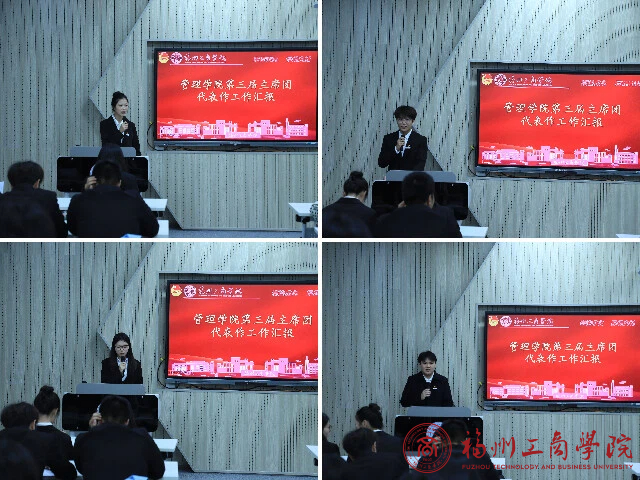 大会第二项,由第三届主席团团委副书记吴雅丽同学、学生会副主席戴高乐同学、信息宣传中心主任苏文琪同学、自律会主任郑锦灏同学以及艺术团团长邱晓春同学作2024-2025年度工作总结汇报,五位学生干部从紧扣时代主题,强化思想引领;聚焦学生需求,深化服务内涵;优化工作机制,提升工作效能三个方面进行汇报,展望新学年,他们共同表示,在学院推进高质量发展的关键时期,团学组织将继续同心协力、砥砺前行,以更加昂扬的斗志和更加务实的作风,全面提升团学工作水平。他们一致认为,学生干部应当永葆初心、勇担使命,以真诚服务彰显价值,用实干奉献书写青春,努力展现新时代青年干部的蓬勃朝气与责任担当。