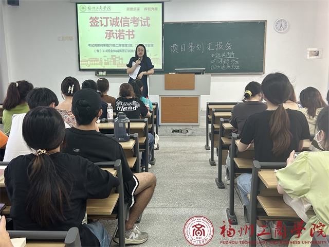 班会上,辅导员首先充分肯定了同学们近一段时间以来的刻苦拼搏、力争人先的进取精神,其次让同学们做好阶段总结与期末目标,鼓励大家要保持势头、稳扎稳打,不要压力要动力,不要紧张要充实。通过有效复习可以弥补自己知识环节和解题技巧中的不足。同时,各班还分别通过PPT讲解、观看视频等形式,通过签订诚信考试承诺书。并且通过讲述考试作弊案例来警示大家,强调了诚信考试的重要性,让学生明白了考试考出的是水平,诚信体现的是做人。