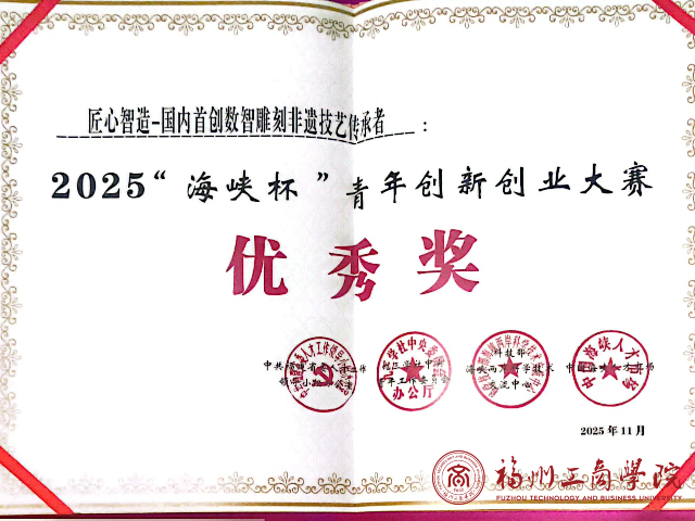 近日,2025“海峡杯”青年创新创业大赛圆满落幕,来自世界杯官网的“匠心智造 - 国内首创数智雕刻非遗技艺传承者”项目,凭借其创新特色与实践价值脱颖而出,成功斩获优秀奖。