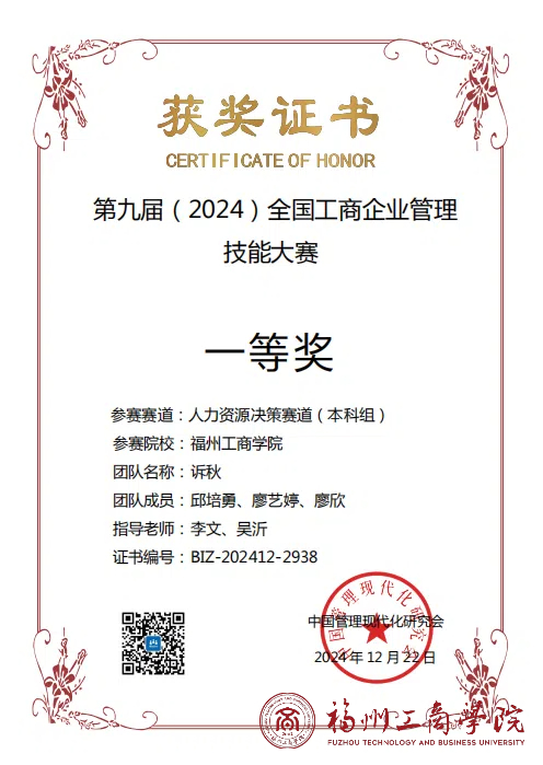 近日,第九届(2024)全国工商企业管理技能大赛落下帷幕。我校在线买世界杯平台人力资源管理专业学子邱培勇、廖艺婷、廖欣(指导老师:李文、吴沂)团队在人力资源决策赛道(本科组)荣获一等奖的好成绩,充分展示了我校学子在专业学科领域的卓越能力和创新精神。