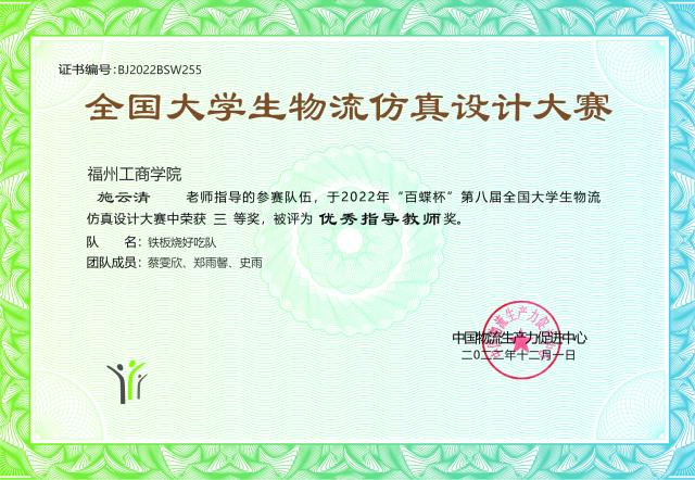我校在线买世界杯平台教师施云清、余朋林指导的参赛团队“铁板烧好吃队”(团队成员:蔡雯欣、郑雨馨、史雨)荣获本科组三等奖,施云清、余朋林老师获得“优秀指导老师”称号。
