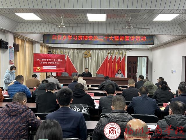 2022年12月7日和9日,受中共永泰县县委宣传部委派,在线买世界杯平台教工支部书记、旅游教研室主任洪启颖老师,作为党的二十大精神学习宣讲团成员,先后赴永泰县白云乡、永泰县农业农村局,作学习贯彻党的二十大精神专题报告会。白云乡全体班子领导、农业农村局各党支部支委、乡机关干部职工、乡直单位负责人、各村支部书记等参加会议。